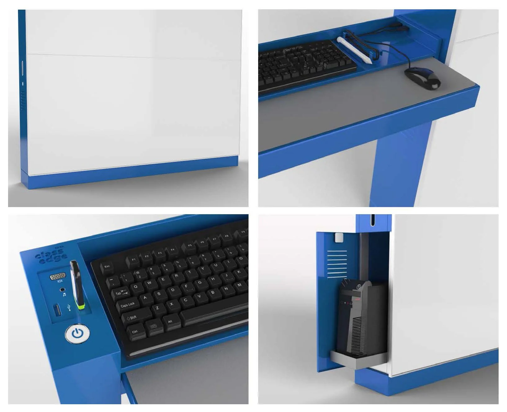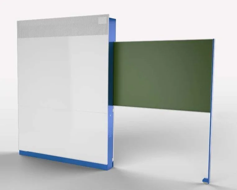 The self-standing structure encapsulates several components, including the computer, backup battery and converter, video and power patch ports, wiring, speakers, interaction tools, and a 4x5’ greenboard.
